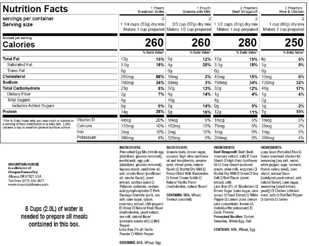- Breakfast meals include 1 Granola with Milk and Blueberries and 1 Breakfast Skillet